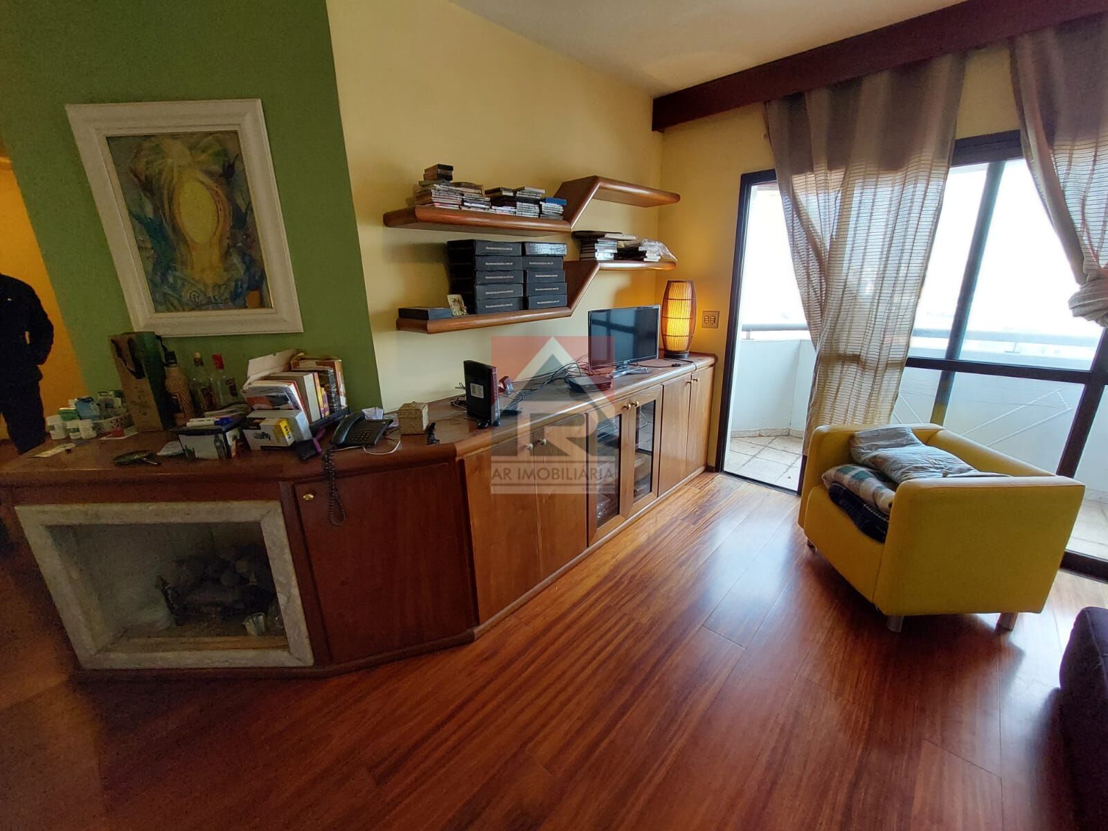 Apartamento com 3 dormitórios com ármario, e 1 sendo suíte, 2 W.C, 1 sala de tv com lareira decorativa e balcão, 1 sala de jantar, cozinha e área de serviço.